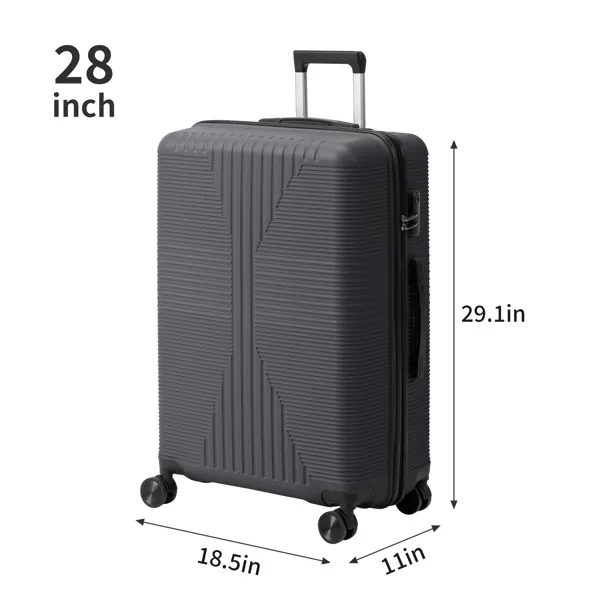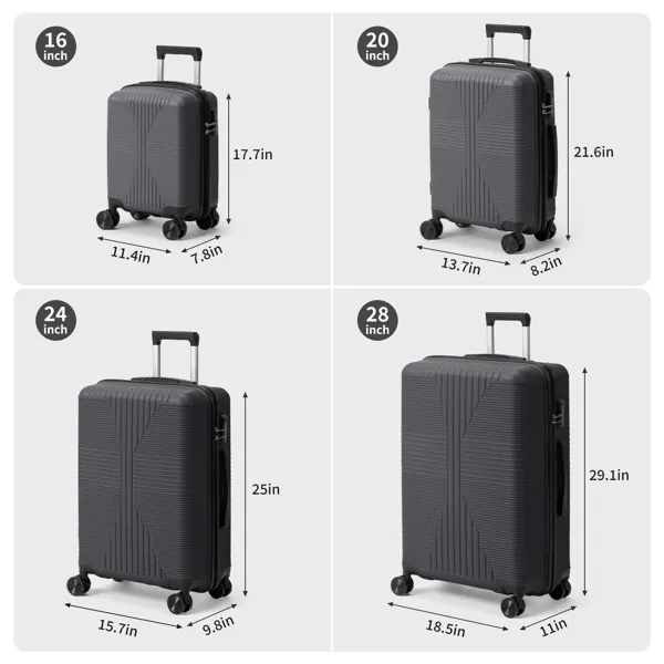 Elevate your travel experience with this comprehensive 4-piece luggage set, meticulously crafted from durable and lightweight PP material. Designed for versatility, the set includes four spinner suitcases in the most practical sizes: 16in, 20in, 24in, and 28in, perfectly catering to short business trips, weekend getaways, and extended family vacations. Each case is equipped with smooth-rolling 360-degree spinner wheels for effortless, multi-directional maneuverability in busy terminals. For your security, every suitcase features a reliable built-in combination lock (non-TSA). Shipped in a protective carton measuring 77*48*29 cm (11.5kg), the set itself presents a sleek, unified profile with a product weight of only 10.5kg, combining robust construction with easy handling for the savvy traveler.