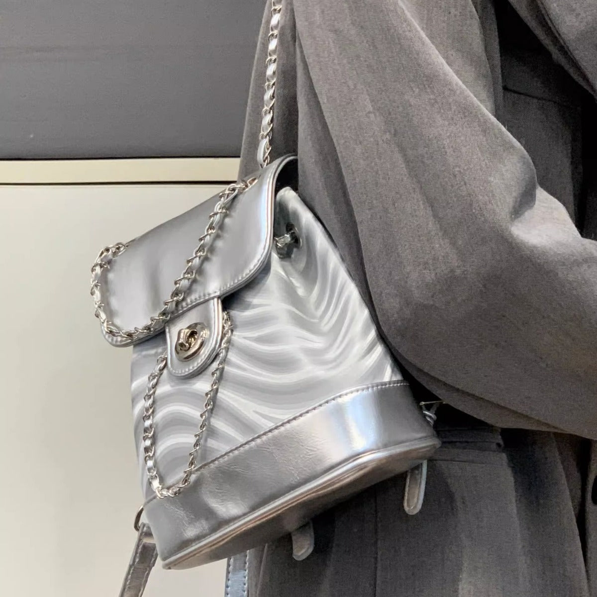 Introducing the stylish and durable Chain Backpack for women, designed with a unique water ripple pattern.