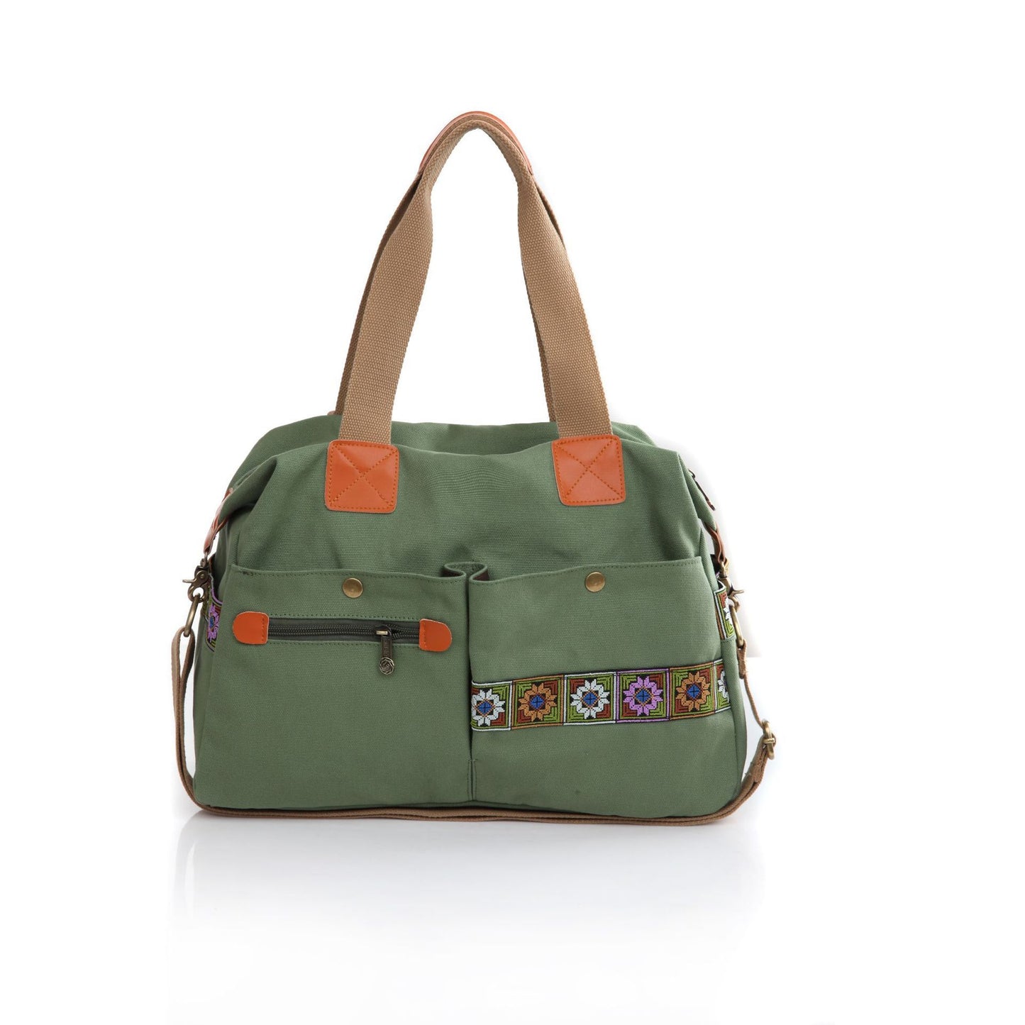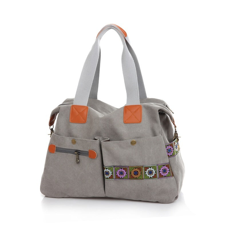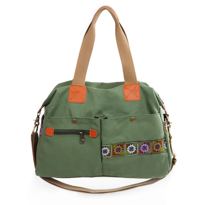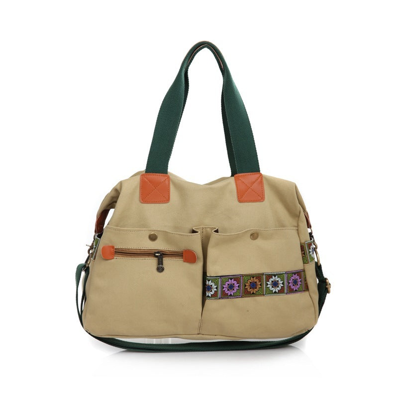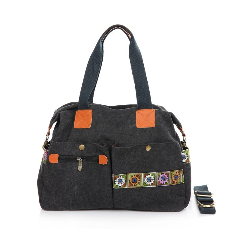 Expertly crafted with embroidered canvas, our handbag features multiple pockets for easy organization.