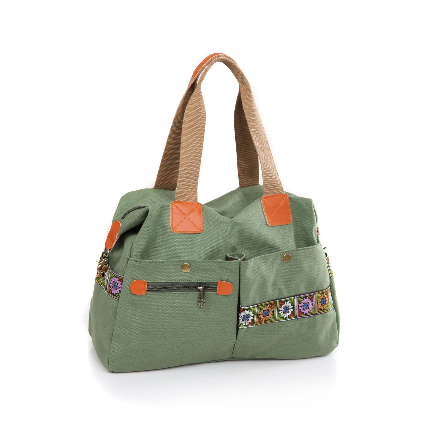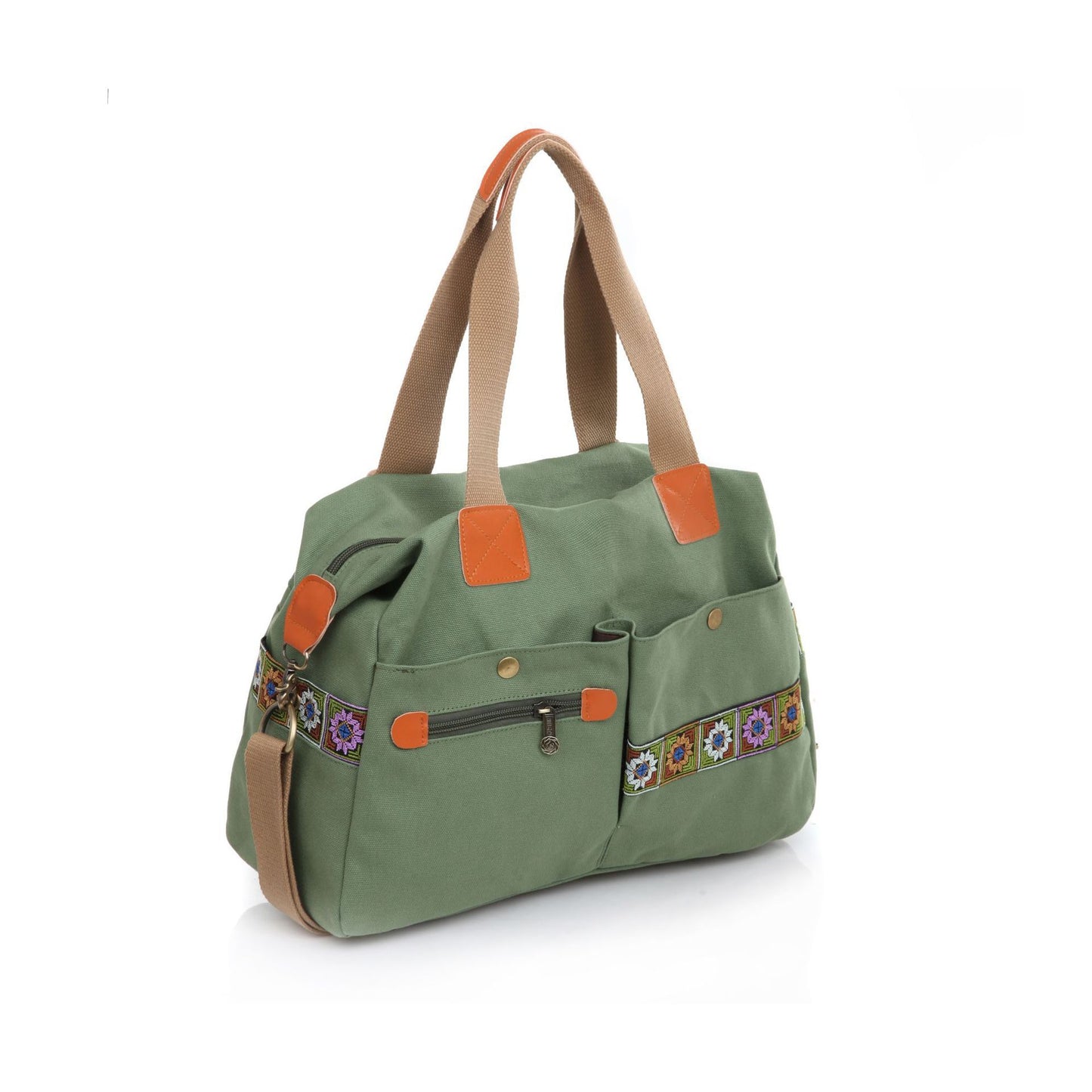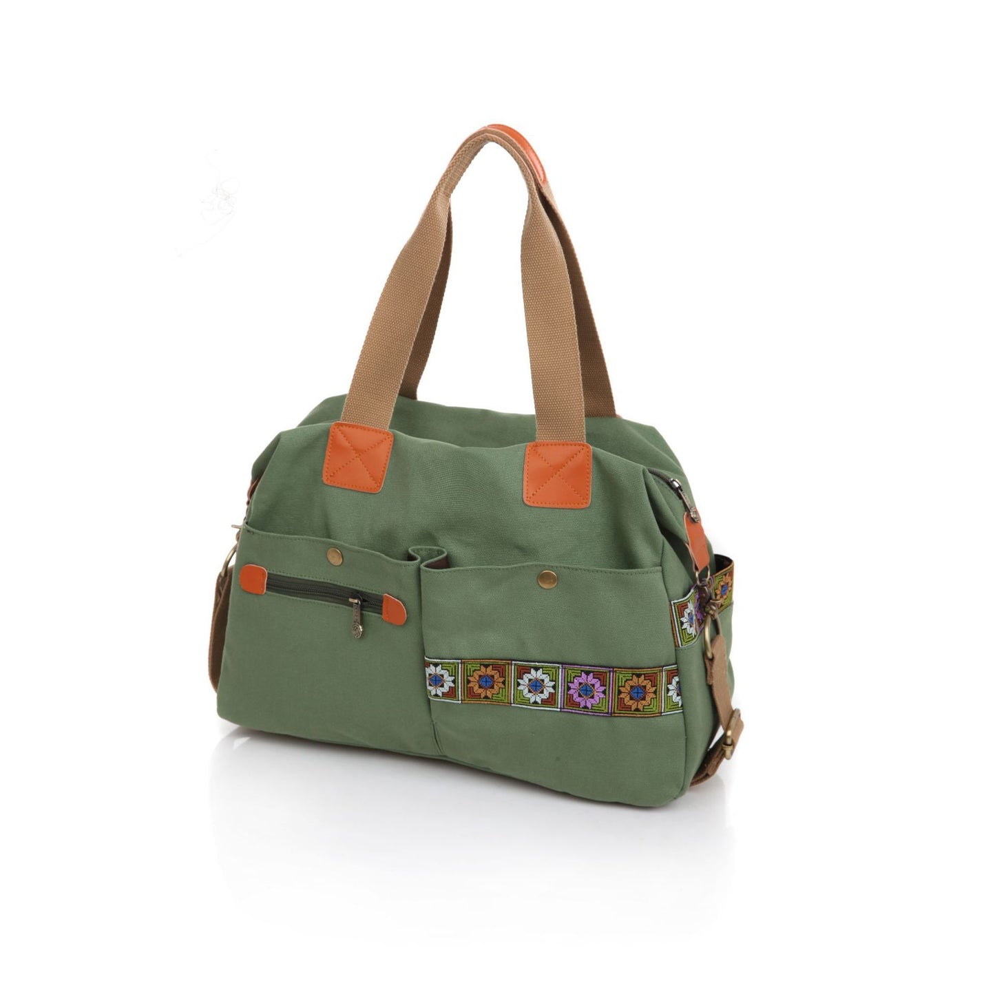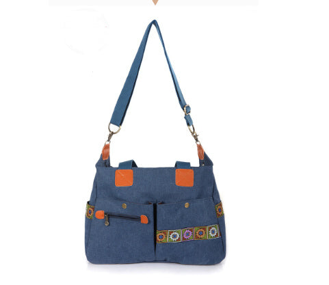 Expertly crafted with embroidered canvas, our handbag features multiple pockets for easy organization.