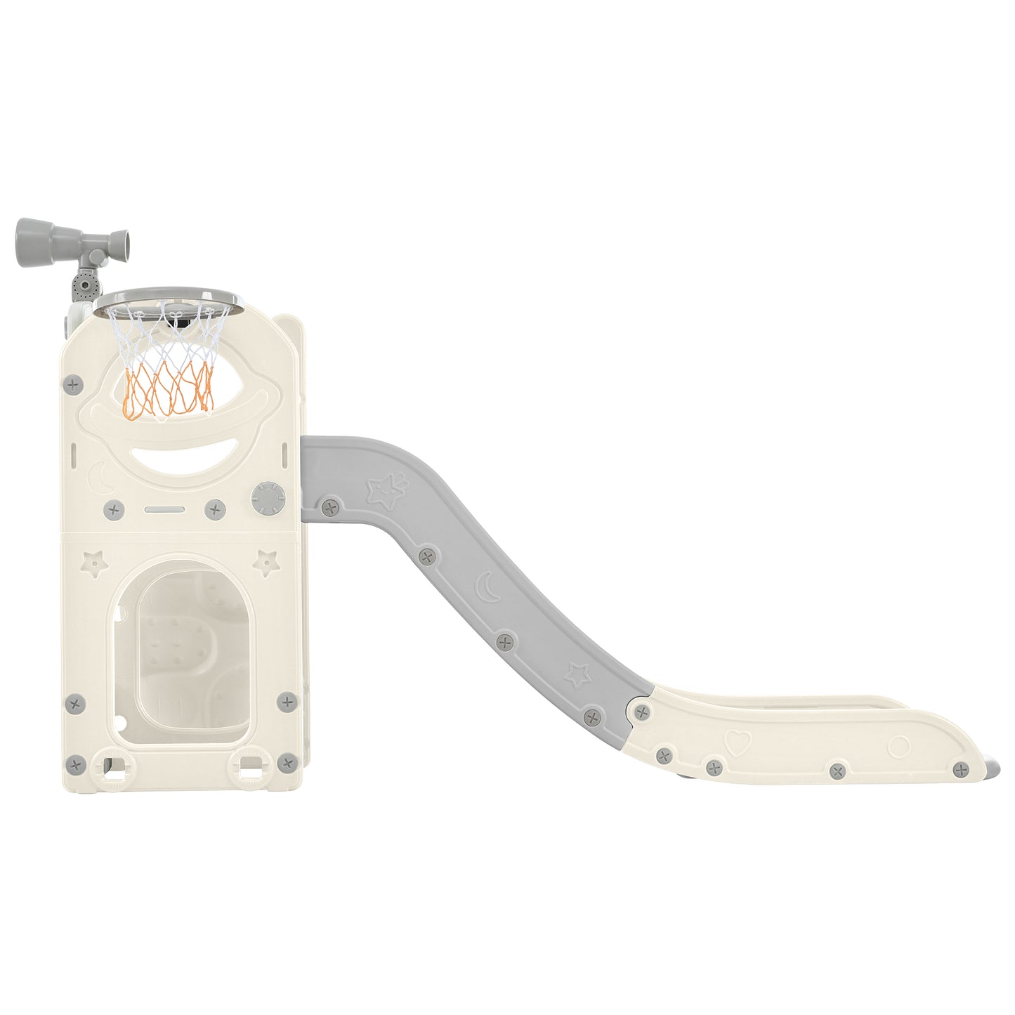Kids Slide Playset Structure 5 in 1, Freestanding Spaceship Set with Slide, Telescope and Basketball Hoop Grey+White + HDPE