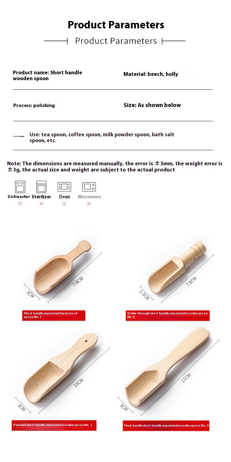 Color: paint-free short handle wooden spoon No. 1 7.8 * 3cm, paint-free short handle wooden spoon No. 2 (Punch Type) 10 * 3cm, paint-free short handle wooden spoon No. 3 (line type) 7.6 * 2.3cm, unpainted short handle wooden spoon No. 4 (thick handle) 11 * 3cm