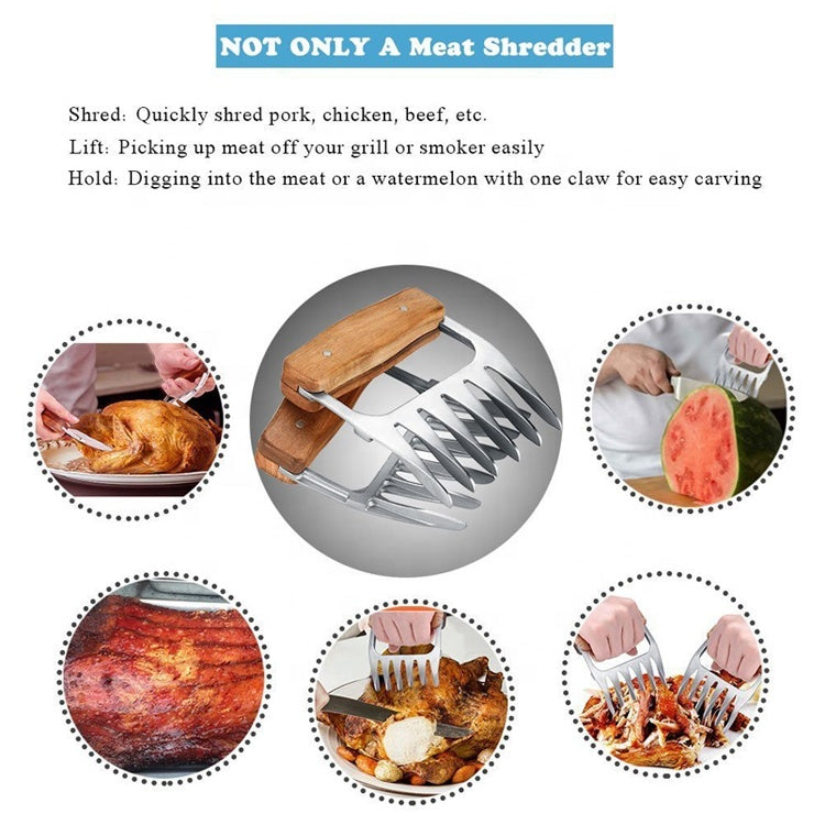 Crafted from durable metal, these meat claws are the perfect tool for shredding and handling large cuts of meat. Their sharp points provide a firm grip for easy and efficient shredding, making them a must-have for any BBQ or kitchen enthusiast. Say goodbye to messy, inefficient shredding and hello to perfectly shredded meat every time.