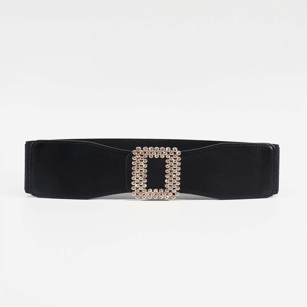 Elastic Female Black Rhinestone Square Buckle Elastic Waistband