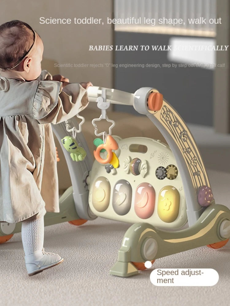 This multifunctional kids toy enhances motor skills and provides interactive play, featuring a 4-in-1 design with a baby walker, gym training equipment, foldable musical play mats, and a piano with lights.