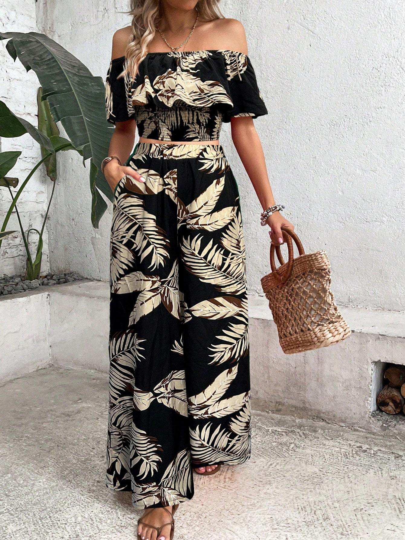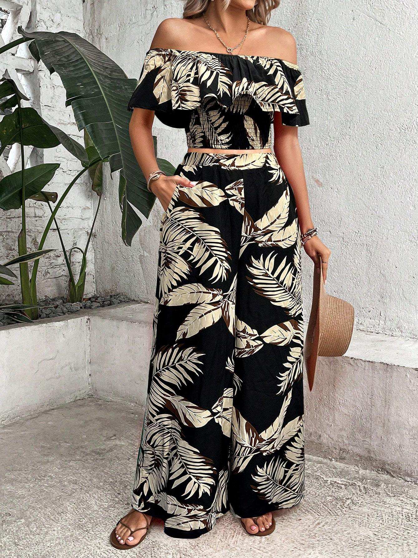 Make a bold statement with this stylish two-piece set, designed for the modern, fashion-forward woman. The off-shoulder neckline and flounce sleeves of the top bring a fresh, feminine flair, while the wide-leg pants offer both comfort and chic sophistication. Featuring a vibrant tropical all-over print, this set perfectly blends boho vibes with contemporary style—ideal for summer outings, beach parties, or casual get-togethers.