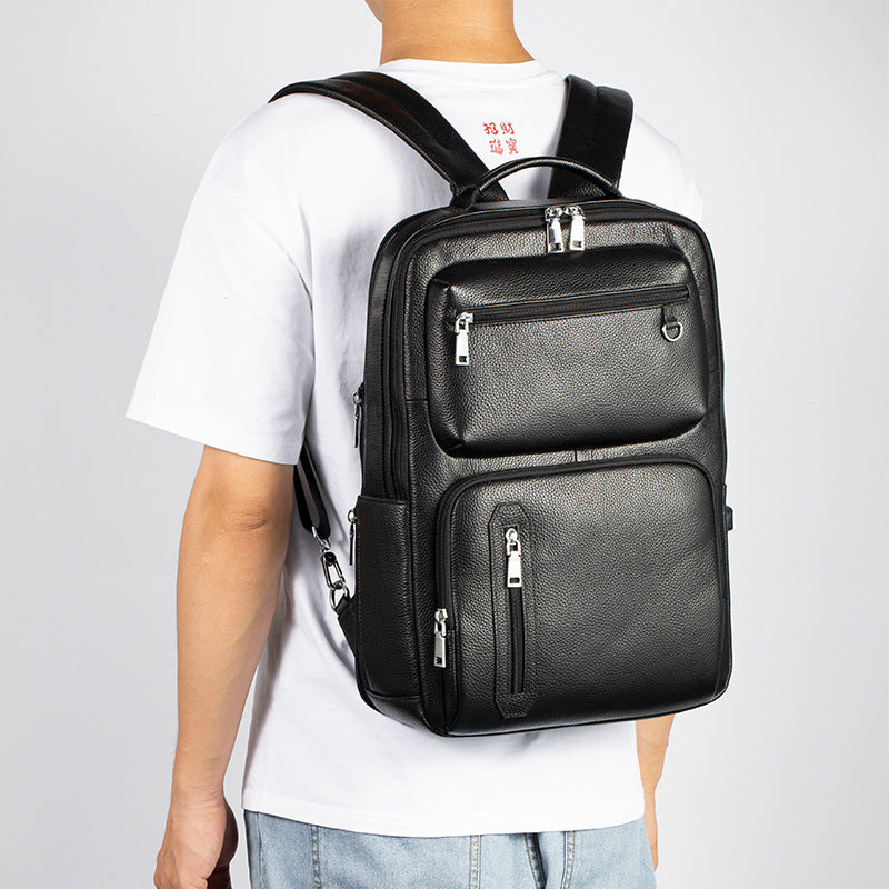 Cowhide Large Capacity Lightweight Lychee Pattern Computer Backpack