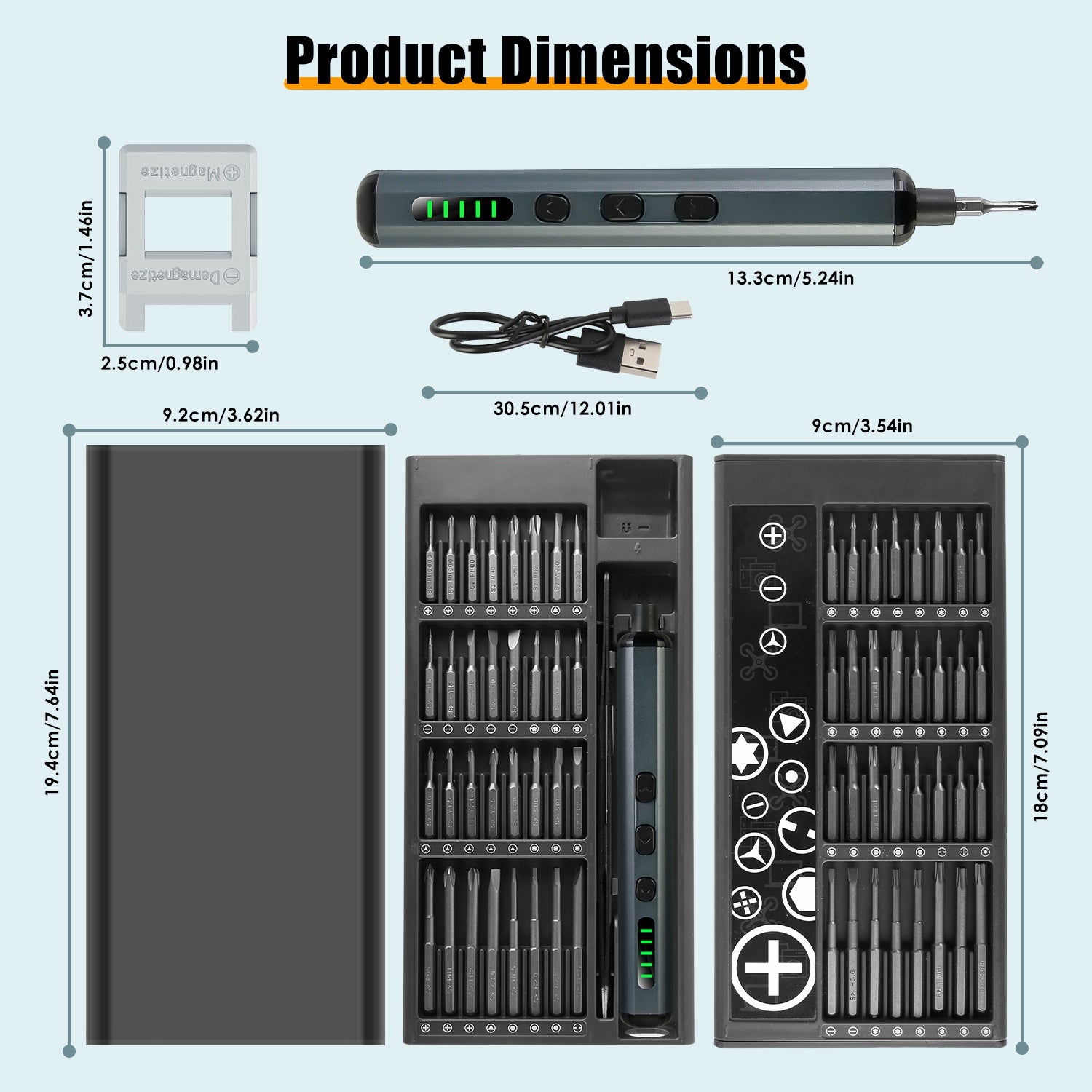 - *70-IN-1 Repair Tool Kit*: This mini screwdriver set includes 70 pieces:1x Electric Screwdriver Handle,1x Storage Case,1x Type-C USB Cable,1x Magnetizer & Demagnetizer,1x Pointed Tweezers,1x Metal Spudger,1x Magnetic Mat,64x Magnetic Bits,meeting your daily repairing needs.