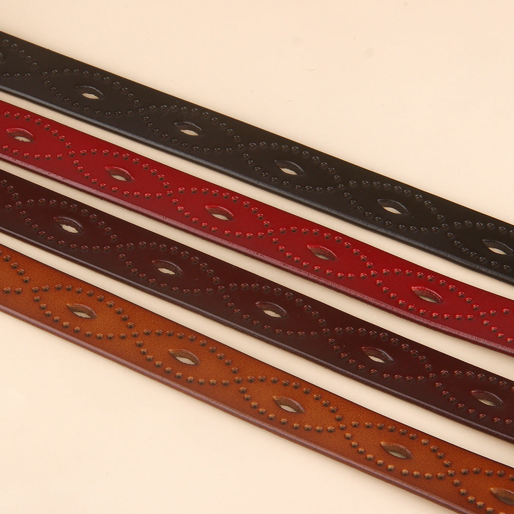Elevate your style with this **vintage hollow belt**, meticulously crafted from **genuine cowhide leather**. Its distinctive **copper pin buckle** adds a touch of timeless elegance, ensuring a refined look for any ensemble. Designed for lasting wear, the classic aesthetic of this belt seamlessly complements both casual and formal styles with understated sophistication. It's the perfect accessory for those who appreciate true quality and refined luxury.