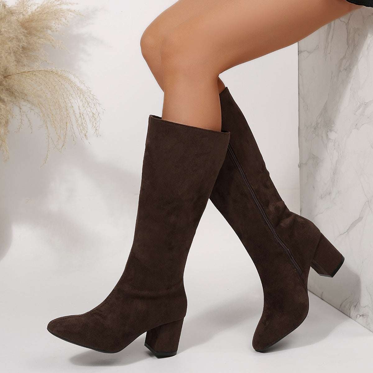 Wide Pointed Toe Chunky Heel Below The Knee Long Boots